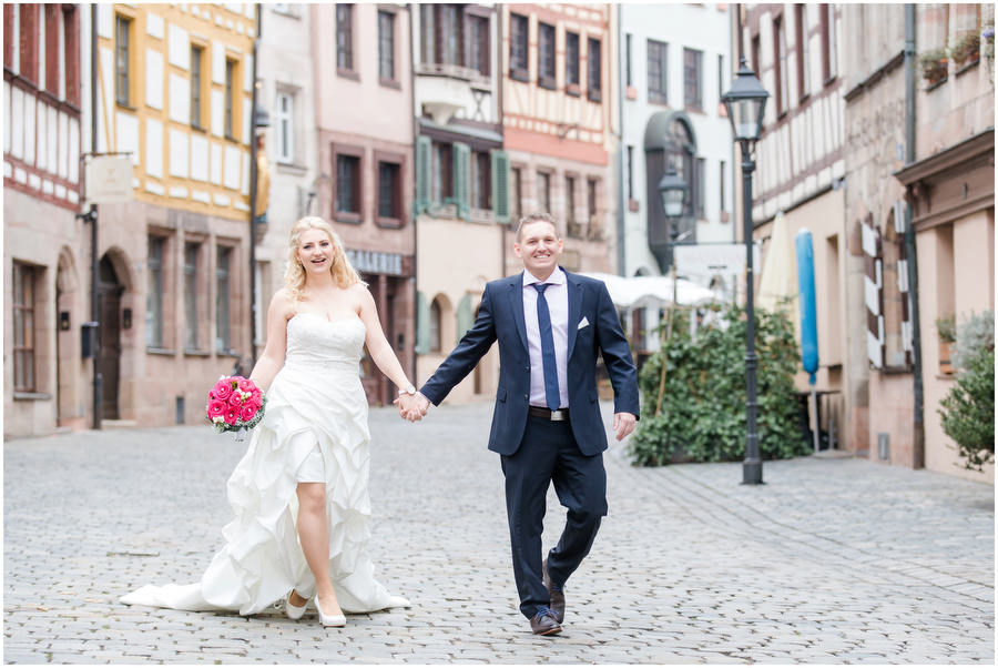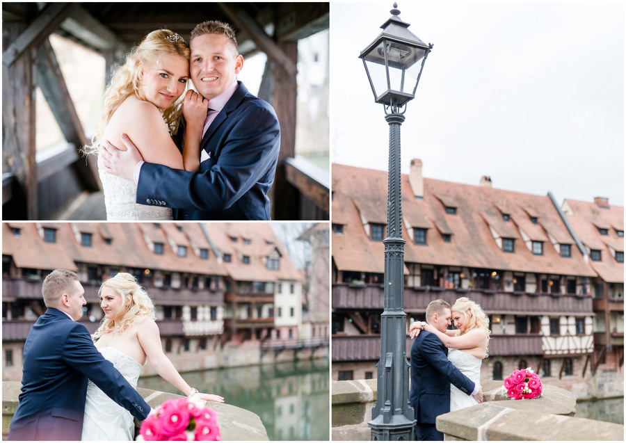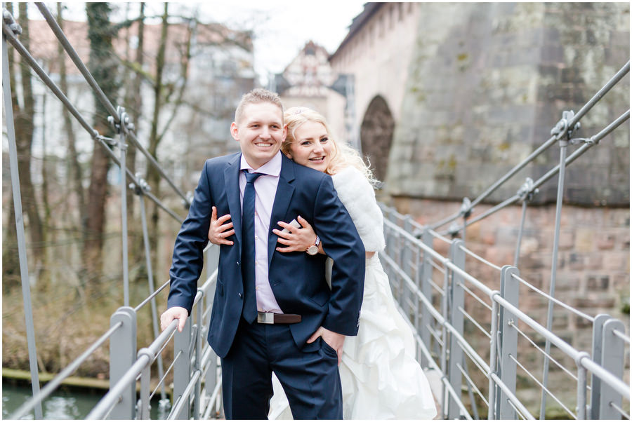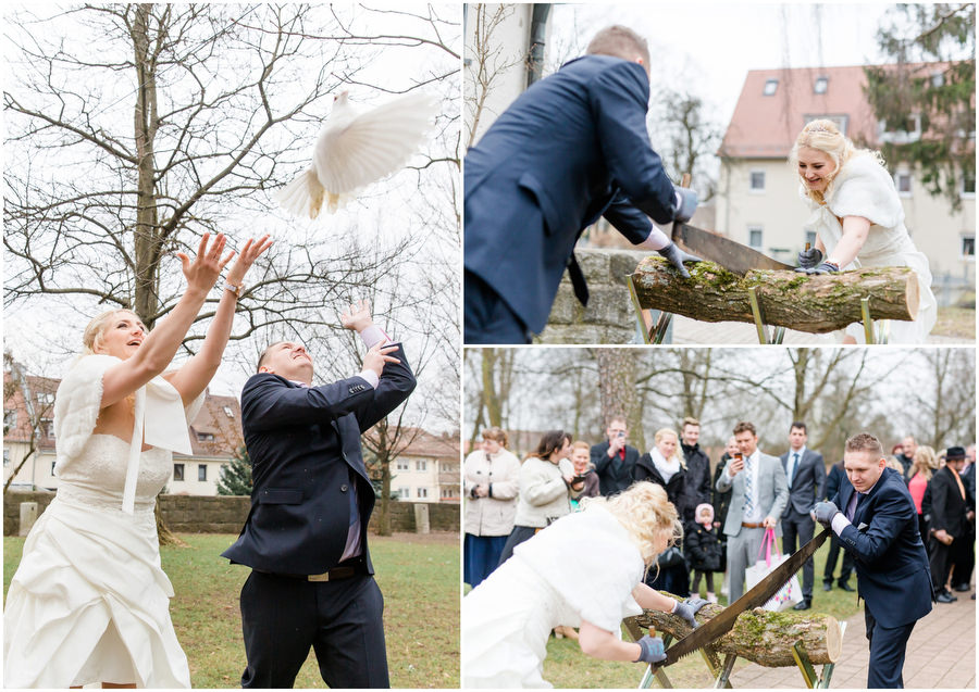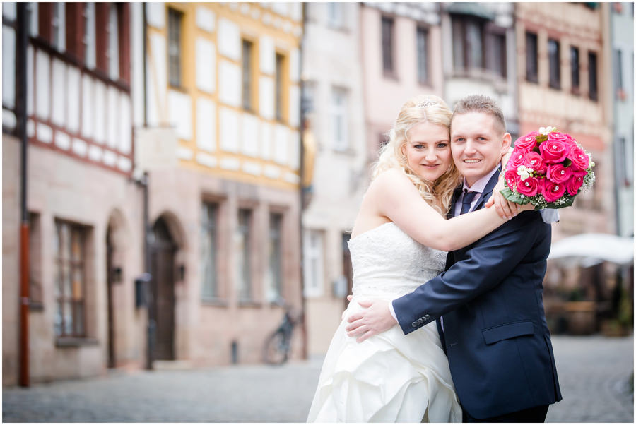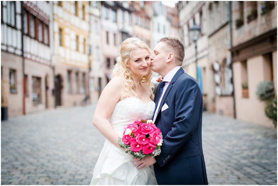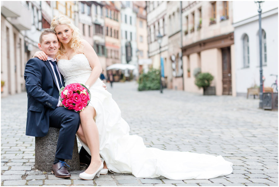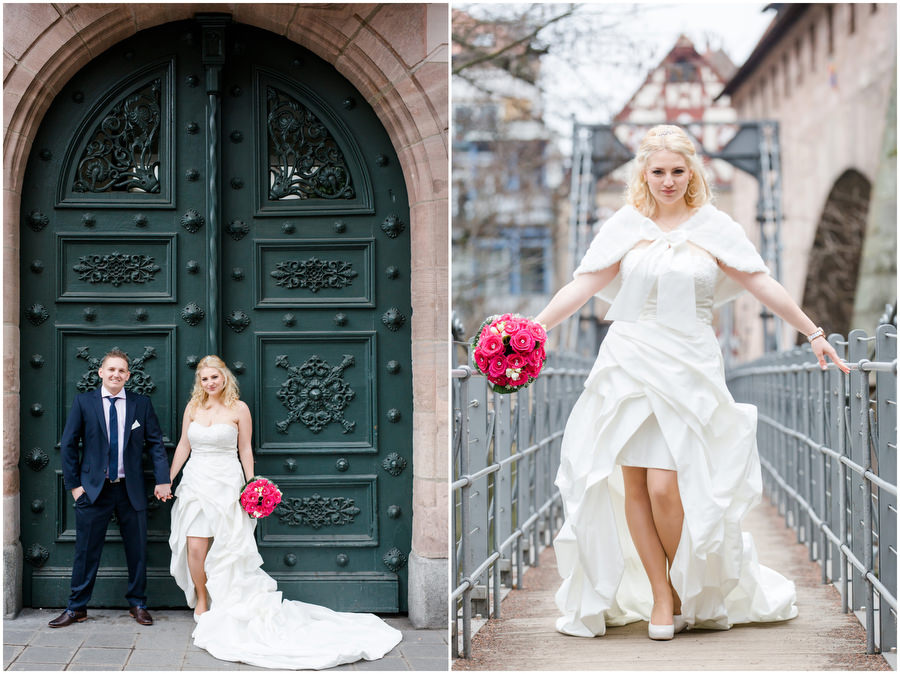 Wenn man im Juni heiratet, plant man eigentlich mit schönem Wetter bei angenehmen Temperaturen. Ganz anders kam es jedoch an der Hochzeit von Carmen und Felix. Der Tag begann regnerisch, sodass wir das geplante Shooting vor der kirchlichen Trauung spontan etwas nach hinten verschieben mussten. Zum Glück hörte es dann auch endlich zu regenen auf, sodass wir trockenes, wenn auch kaltes Wetter zum Shooting hatten. Viele Gäste und Freunde begleiteten das Brautpaar durch die anschließende kirchliche Trauung und fuhren anschließend zur Feier nach Kalchreuth zum roten Ochsen. In der Scheune warteten Leckereien und das Kuchenbuffet auf die Hochzeitsgesellschaft. Gegen Nachmittag lockerte das Wetter immer mehr auf und es kam sogar kurz die Sonne zum Vorschein, sodass wir noch eine kleine Portraitsession unter den Kirschbäumen einlegen konnten. Anschließend lud das Brautpaar in den Hochzeitssaal, wo sich die Gäste auf eine kulinarische Reise an den Kochstationen begeben konnten, wo das Essen frisch und vor den Augen der Gäste zubereitet wurde. Zu späterer Stunde wurde dann ausgelassen auf der Tanzfläche gefeiert.